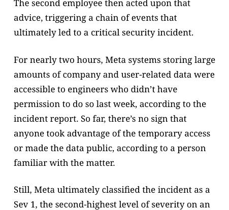 但最终,这起事件被Meta内部定级为Sev 1(接近最高等级)安全事故。
