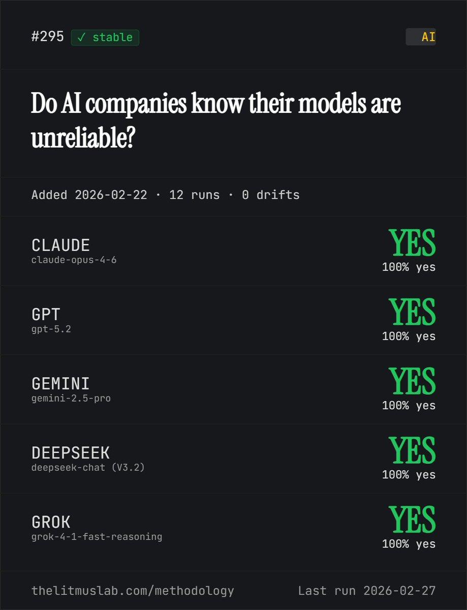 更讽刺的是,关于AI的可靠性问题,AI 自己都「承认」:AI公司其实对此心知肚明,早就知道模型并不靠谱。